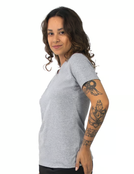A Camiseta Feminina da Moderna apresenta uma modelagem ajustada, estilo Baby Look.